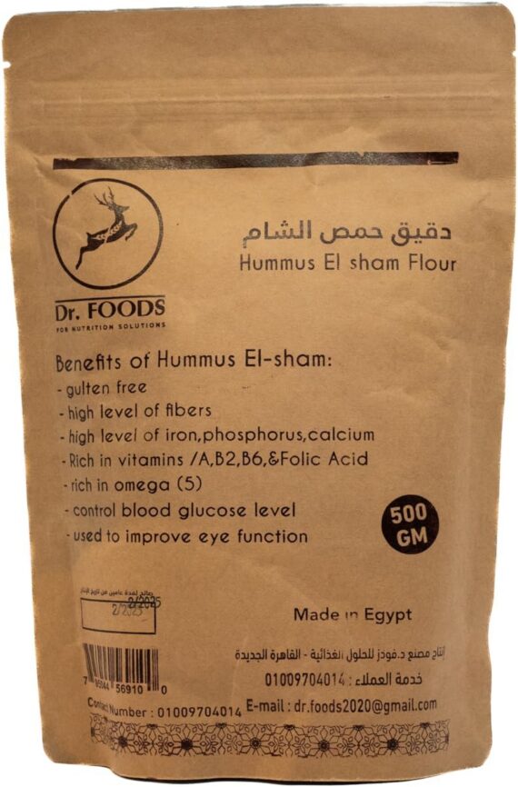 Dr. Foods Hummus El-sham Flour 500g – Gluten-free chickpea flour rich in plant protein, dietary fibre, vitamins, and minerals. Perfect for falafel, breads, and healthy baking.