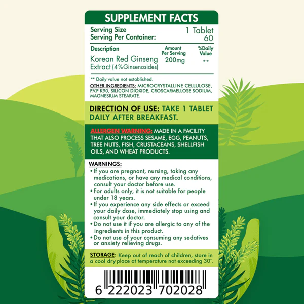 Premium Korean Red Ginseng Tablets deliver 200mg of pure extract to boost energy, immunity, and mental clarity. A natural adaptogen for daily vitality.
