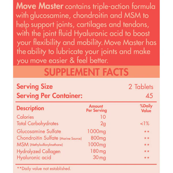 Move Master is a powerful joint health supplement combining Glucosamine, Chondroitin, MSM, and Hyaluronic Acid to protect cartilage, reduce pain, and support flexibility.