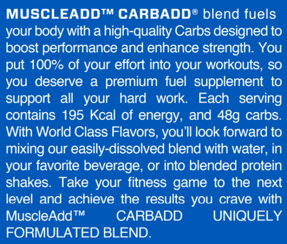 Muscle Add Carb Add is an ultra-premium carbohydrate blend that fuels your workouts with energy, enhances strength, and speeds up muscle recovery with every serving.