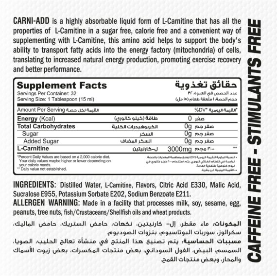 Muscle Add Carni Add is a sugar-free, calorie-free, liquid L-Carnitine formula that supports weight management, fat burning, and recovery.