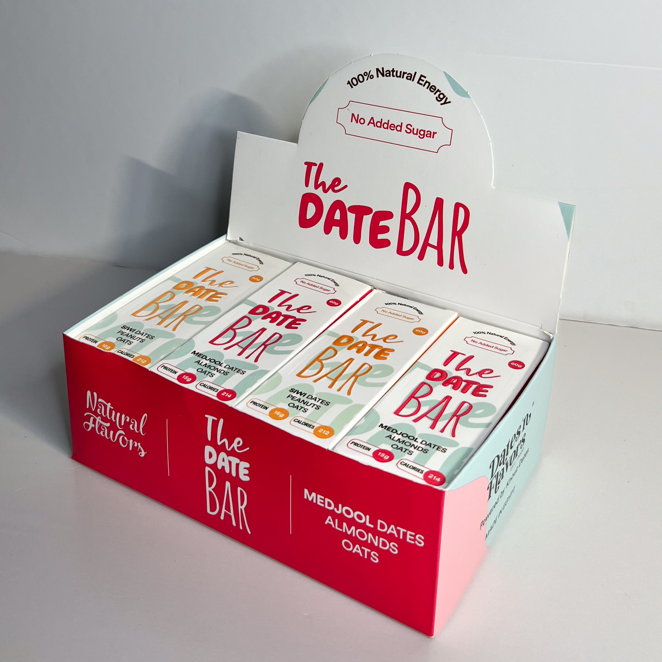 A premium mix of 12 natural date bars – 6 bars made with Siwi dates, peanuts, and oats, and 6 bars with Medjool dates, almonds, and oats. Plant-based energy with no artificial additives.